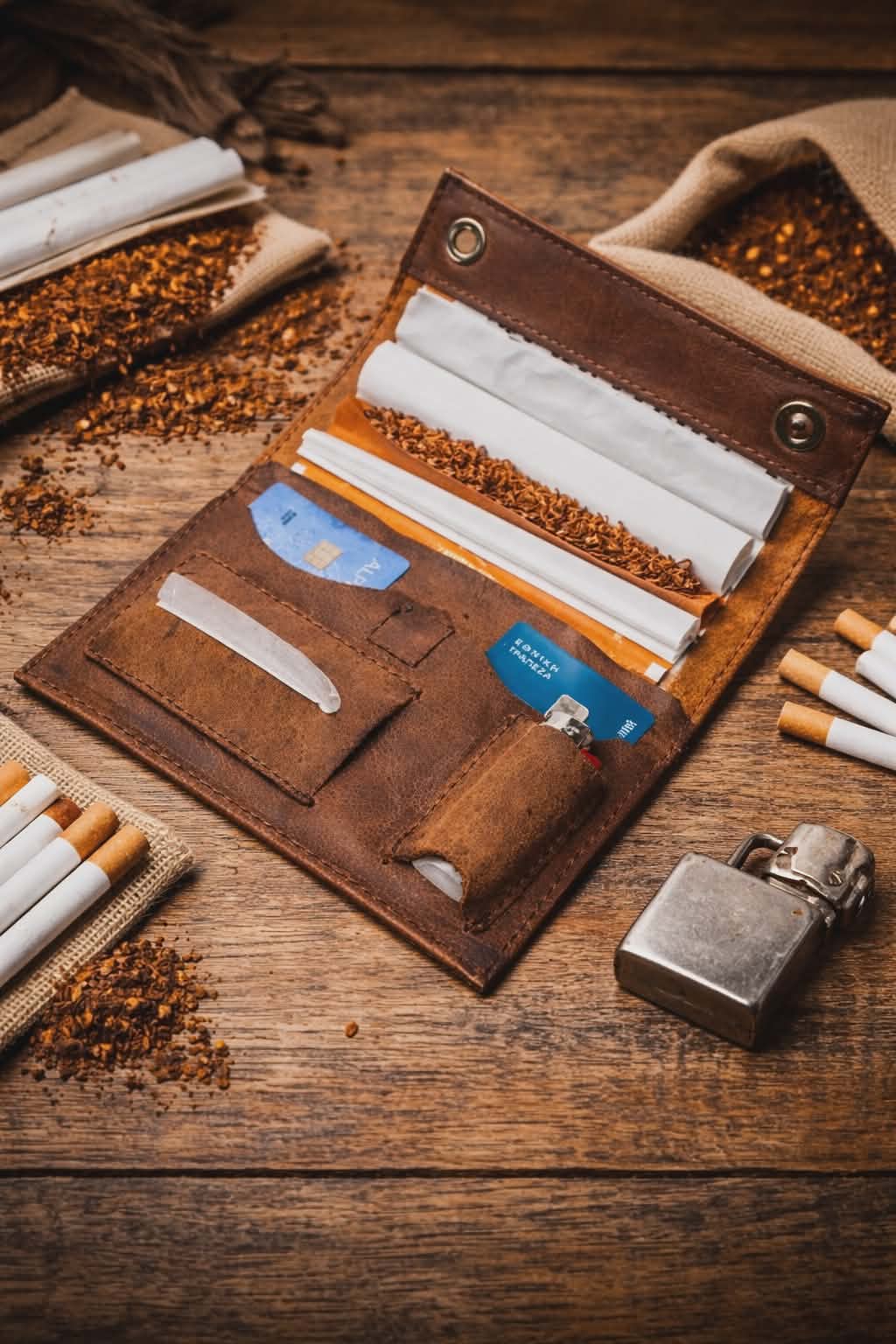 Χειροποίητη Δερμάτινη θήκη καπνού καφέ από δέρμα μοσχάρι υψηλής ποιότητας και αντοχής, με θήκη για χαρτάκια και αναπτήρα καί υποδοχή για 2 εώς 6 κάρτες. Η αποτύπωση της εικόνας έχει γίνει με Laser πράγμα που την καθιστά αναλλοίωτη και ανεξίτηλη στο χρόνο