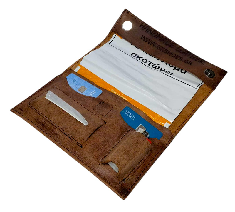 Χειροποίητη Δερμάτινη θήκη καπνού καφέ από δέρμα μοσχάρι υψηλής ποιότητας και αντοχής, με θήκη για χαρτάκια και αναπτήρα καί υποδοχή για 2 εώς 6 κάρτες. Διπλό μαγνητικό κούμπωμα